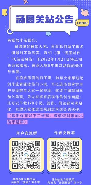 很遗憾的通知大家,虽然我们做了很多但最终不敌现实。我们(即“汤圆创作PC站及M站)于2022年1月21 日停止相关运营服务,感谢大家8年来对汤圆的关注与热爱。