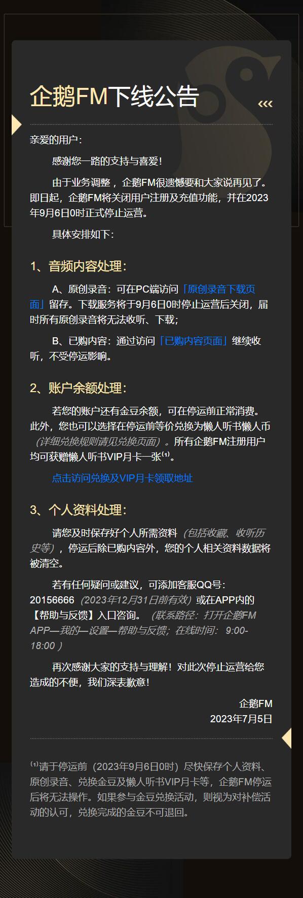 ⁽¹⁾请于停运前(2023年9月6日0时)尽快保存个人资料、原创录音、兑换金豆及懒人听书VIP月卡等,企鹅FM停运后将无法操作。如果参与金豆兑换活动,则视为对补偿活动的认可,兑换完成的金豆不可退回。