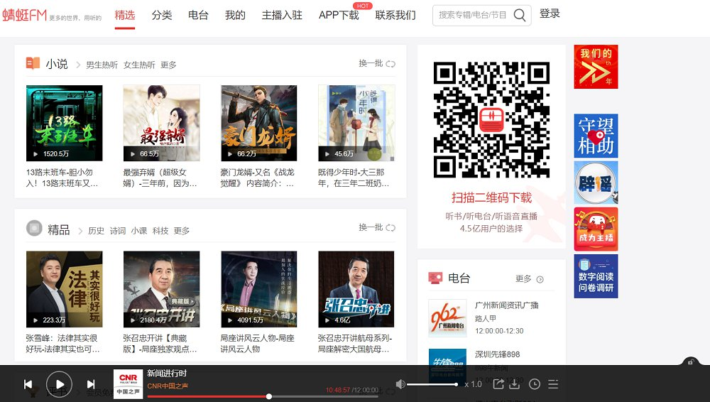 蜻蜓FM蜻蜓FM网络收音机,囊括了国内外数千家网络广播,并与全国各大地方电台合作,将传统电台整合到网络电台中,为用户呈现前沿丰富的广播节目和电台内容,涵盖了有声小说、相声小品、新闻、音乐、脱口秀、历史、情感、财经、儿童、评书、健康、教育、文化、科技、电台等三十余个大分类。蜻蜓FM是多年来用户喜爱的音频应用,手机必装的应用!