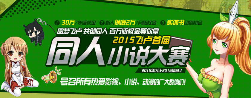2015飞卢首届同人小说大赛为了迎合网络文学蓬勃发展的态势,为广大同人小说爱好者提供更多的优质作品,给同人作者们一个更好的发展平台。国内最大的同人小说网站飞卢中文网将举办”2015飞卢首届 同人小说大赛”本次大赛主要面向“同人小说”,赛期长达12个月。自2015年7月10日正式启动,至2016年6月10日截稿。为了保障创作新人与资深写手同场公平竞技,本次大赛将分为“主赛区”及“新人赛区”。新人赛区独立设置“新人领袖奖”“新人创新奖”等奖项。在奖项的评选和设置上,也充分体现网络文学的特色,按评选周期即时发放大赛版权金,而无需等到大赛结束。真诚欢迎广大网友踊跃参与,为网络文学的持续繁荣发展添砖加瓦,愿大家的梦想在飞卢展翅飞翔。