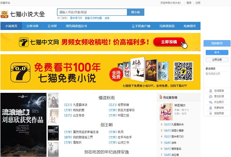 七猫中文网七猫中文网(免费小说大全)与国内各大小说站合作,为小说爱好者提供更多更全的各类免费小说上百万本。七猫免费小说包括言情小说,穿越小说,玄幻小说,校园小说,都市小说,武侠小说,网游小说等等。七猫中文网只有想不到,没有找不到!