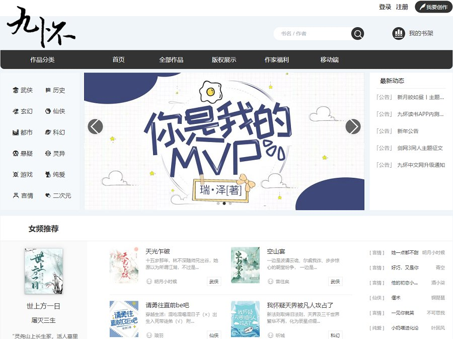 九怀中文网九怀中文网提供原创玄幻、武侠、仙侠、都市、言情、历史、游戏、科幻、悬疑、二次元等类型小说。欢迎作者和读者小伙伴加入!